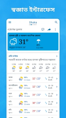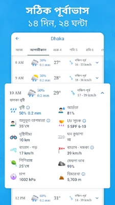 আমাদের এই অ্যাপের ব্যবহারকারী-বান্ধব ইন্টারফেসে আরও গভীরে গেলে আপনি আবিষ্কার করবেন একগুচ্ছ শক্তিশালী বৈশিষ্ট্য। উন্নত রেইন রাডার আপনাকে বৃষ্টির প্রতিটি ফোঁটা নিখুঁতভাবে ট্র্যাক করতে সাহায্য করবে। তাপমাত্রার স্তর থেকে শুরু করে বৃষ্টি, তুষারপাত, বায়ুমণ্ডলীয় চাপ এবং বায়ু ও ঢেউয়ের গতিপথের অ্যানিমেটেড চিত্রসহ আমাদের ইন্টারেক্টিভ আবহাওয়ার মানচিত্র আপনাকে একটি সম্পূর্ণ চিত্র দেবে। এছাড়াও, গত ১২ ঘণ্টার স্যাটেলাইট ছবি আপনাকে অতীতের আবহাওয়ার গতিবিধি বুঝতে সহায়তা করবে। শুধুমাত্র তাই নয়, বাতাসের গুণগত মান, আর্দ্রতা এবং অ্যালার্জি-উৎপাদনকারী কারণগুলির বিস্তারিত তথ্য আপনাকে বাইরের কার্যকলাপের পরিকল্পনা করতে এবং সুস্থ থাকতে সাহায্য করবে। সূর্যোদয়, সূর্যাস্ত এবং চাঁদের দশা সম্পর্কিত জ্যোতির্বিজ্ঞান বিষয়ক তথ্য আপনার হাঁটাচলা, সাইকেল চালানো বা মাছ ধরার মতো শখ পূরণে নতুন মাত্রা যোগ করবে।